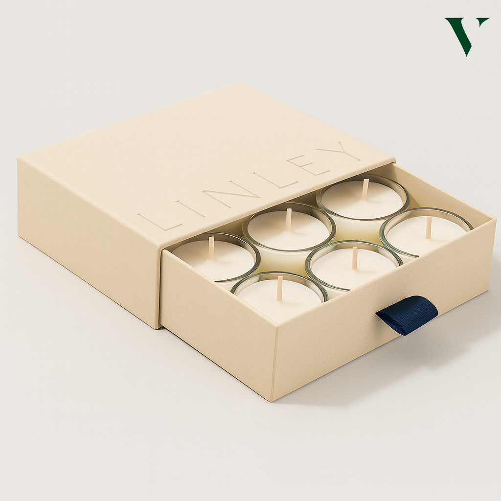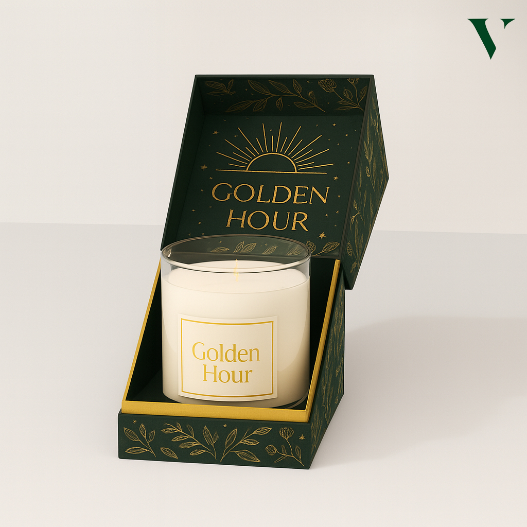 Two-piece boxes, sleeve boxes, and hexagon two-piece boxes are popular for gifting candles in deluxe packaging, which makes the unboxing moment unbeatable.