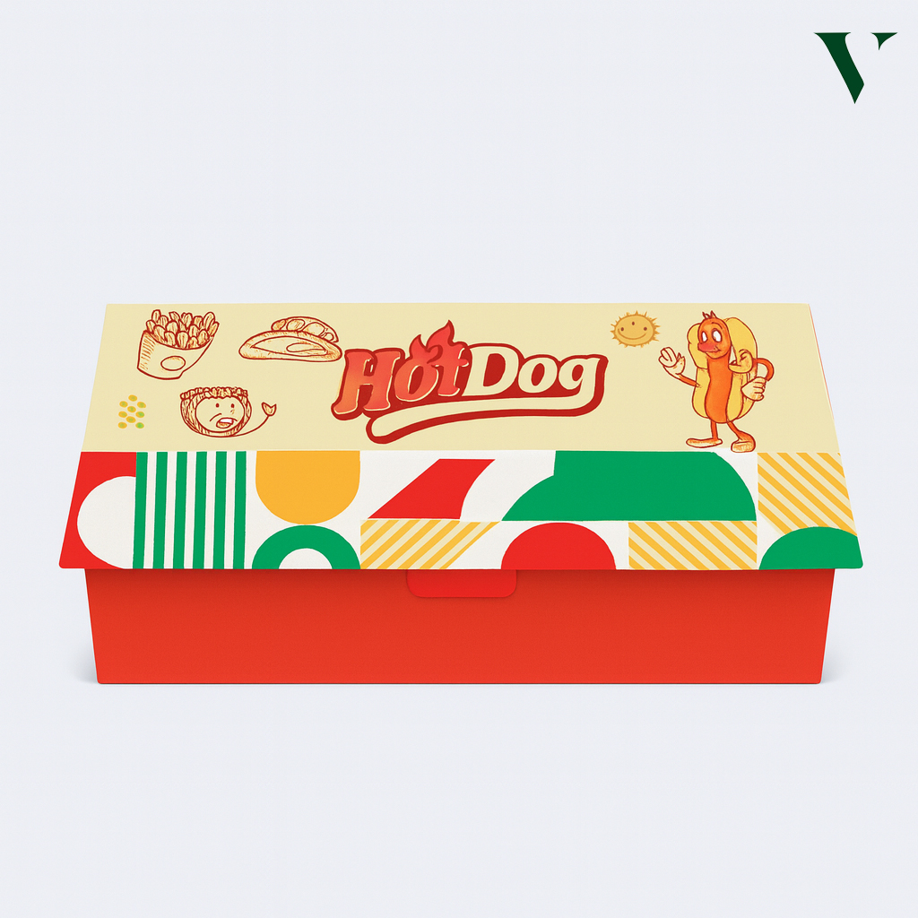 Wholesale custom hot dog boxes are designed for food brands that need packaging that balances speed, hygiene, and presentation. Hot dogs are often served on the go, and poorly designed packaging can cause spills, sogginess, or customer frustration. That’s why we focus on box structures that hold the product, manage grease, and stay comfortable to carry. These boxes are made to help maintain freshness while keeping hands and surfaces clean. We offer customization in size, opening style, and printing so your branding remains visible even during quick service.